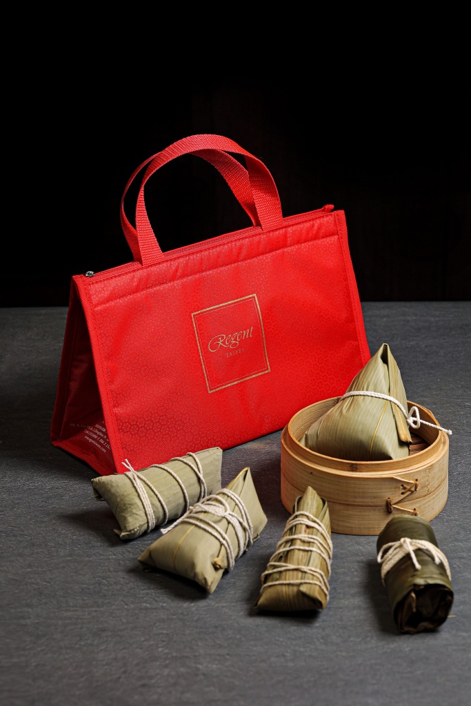 「冠軍粽香禮盒」內含冠軍鮑粽、松露牛肉粽、綠竹筍鮮肉粽、八寶芋泥粽、紫米豆沙粽5款各1顆,並附贈晶華端午節限定版時尚精美保冷提袋,送禮自用的最佳首選。