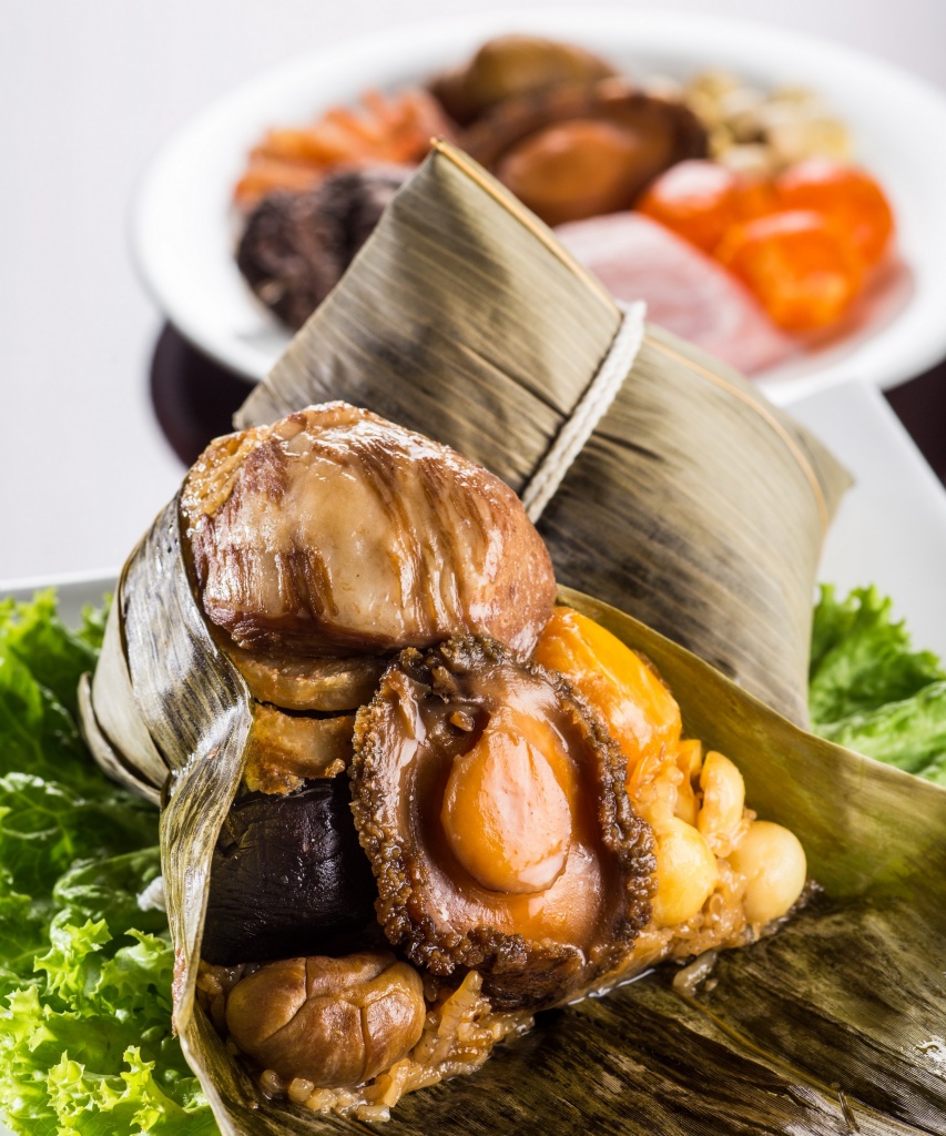 「晶華冠軍鮑粽禮盒」主廚將香Q糯米與滷肉汁及調味料拌炒均勻,包入長6公分、重30克豐腴新鮮整顆鮑魚、柔嫩的松阪豬肉、鹹香入味的肥美蝦乾、鮮美入味的香菇、香甜栗子、蓮子及綿密鹹蛋黃等頂級食材,組成這款極品美味。
