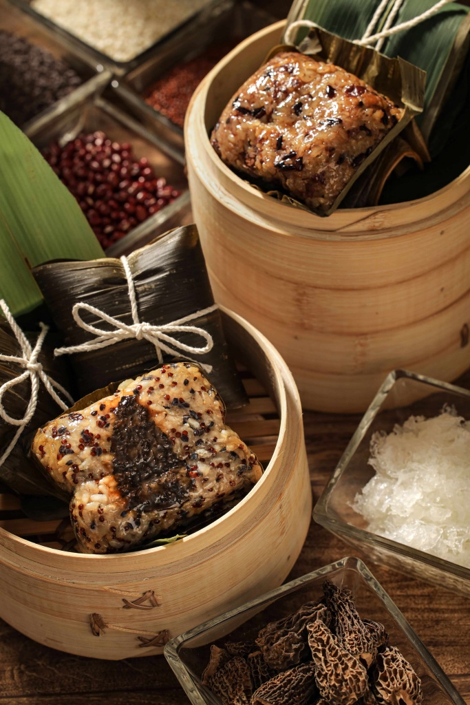鹹粽「羊肚菌珍珠粽」選用長糯米與圓糯米浸泡一晚,再以粵式料理中的頂級乾貨羊肚菌、牛肝菌、花菇、松本茸及有穀物中的紅寶石之稱的紅藜麥、亞麻籽等健康食材入餡增香,米粒經過長時間的烹調,口感綿密滑順,搭配鹹香軟嫩的餡料,滋味豐醇,品嘗時還帶有淡淡荷葉清香。
