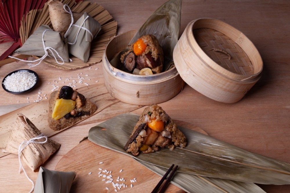 義大天悅飯店推出葷素二款端午粽禮盒,最傳統的粽香滋味「古早八寶粽禮盒」,深獲好評重磅回歸,吸附飽滿的特調滷汁鹹香不膩,肉質軟嫩銷魂,濃郁傳統滋味讓人食指大動,還有具畫龍點睛之妙的山珍海味餡料,挑選圓糯米蒸過後以粽葉包覆,香氣四溢。