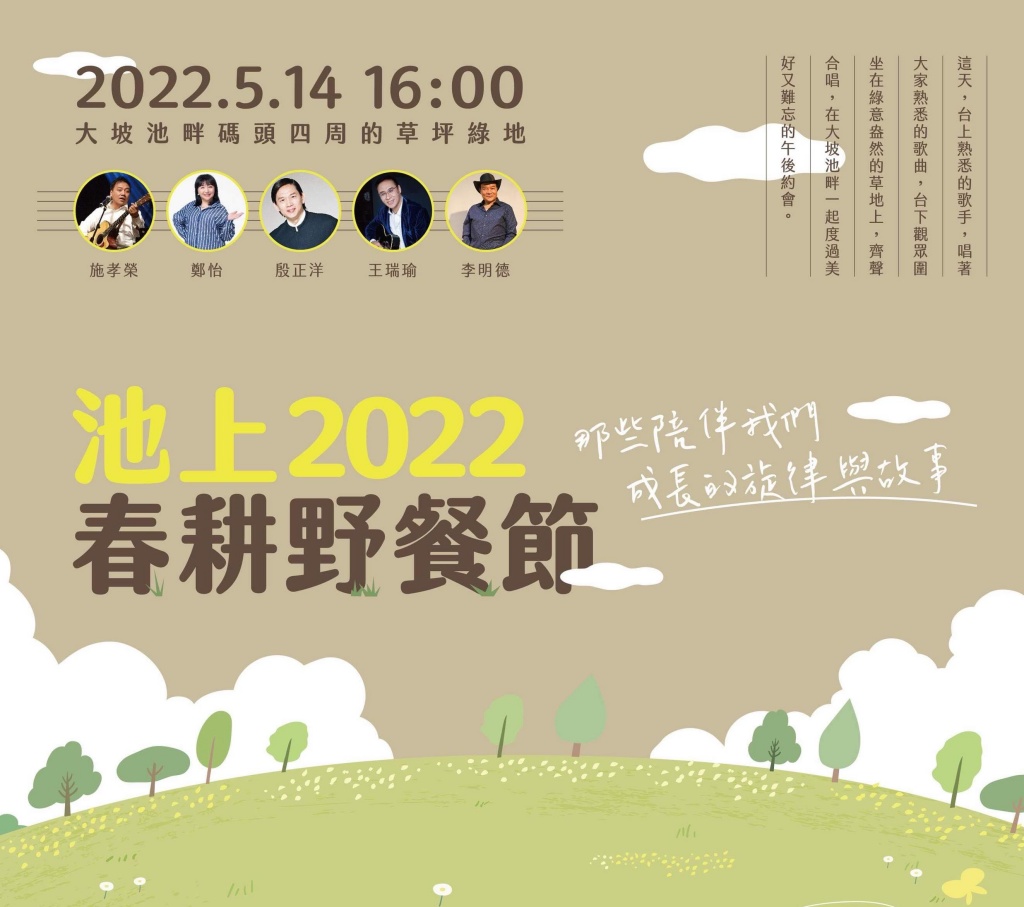 《池上2022春耕野餐節》今年特別邀請民歌界的「四王一后」施孝榮、殷正洋、王瑞瑜、李明德與鄭怡親臨池上,在池上大坡池畔用歌聲帶大家重溫當年的美好時光。