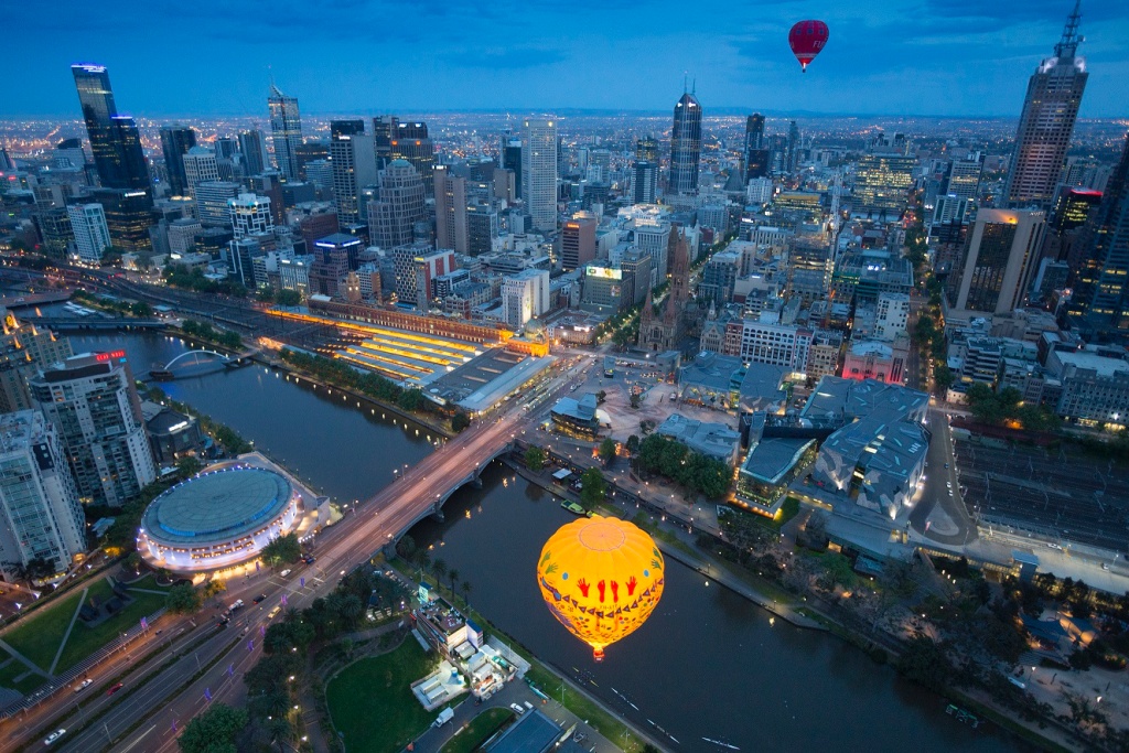 Global Ballooning Australia迎接高空曙光熱氣球之旅:熱氣球每天於日出時分在墨爾本市中心、亞拉河谷Yarra Valley與曼斯菲爾德Mansfield出發,冒險之旅在天未亮時便開始,熱氣球隨著太陽緩緩上升,可以欣賞澳洲的晨曦,從高空俯瞰維多利亞州美景別有一番滋味。沒有什麼比這個更好的方式來遊覽世界上最宜居的城市墨爾本了。
