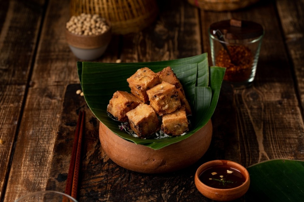 「厚工芋香金磚」是極少有的厚工料理,將豆腐壓碎、放入香菇絲、芋頭塊高溫蒸熟後,裁切小塊入高溫油鍋炸到金黃色澤,搭配主廚以羅望子汁與棕梠糖、辛香料一起熬煮的醬汁,層次多元且豐富。