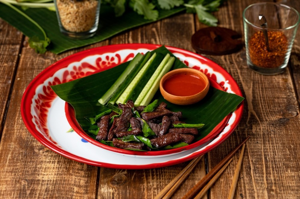 「熟成風乾牛肉」是將嚴選新鮮牛肉先順著牛肉纖維的紋理方向,切成一口入的條狀,以泰式香料醃製達4個小時增添風味,最後瀝乾進入風乾階段,熟成後的牛肉條利用高溫酥炸,更能帶出牛肉本身的味道與嚼勁。