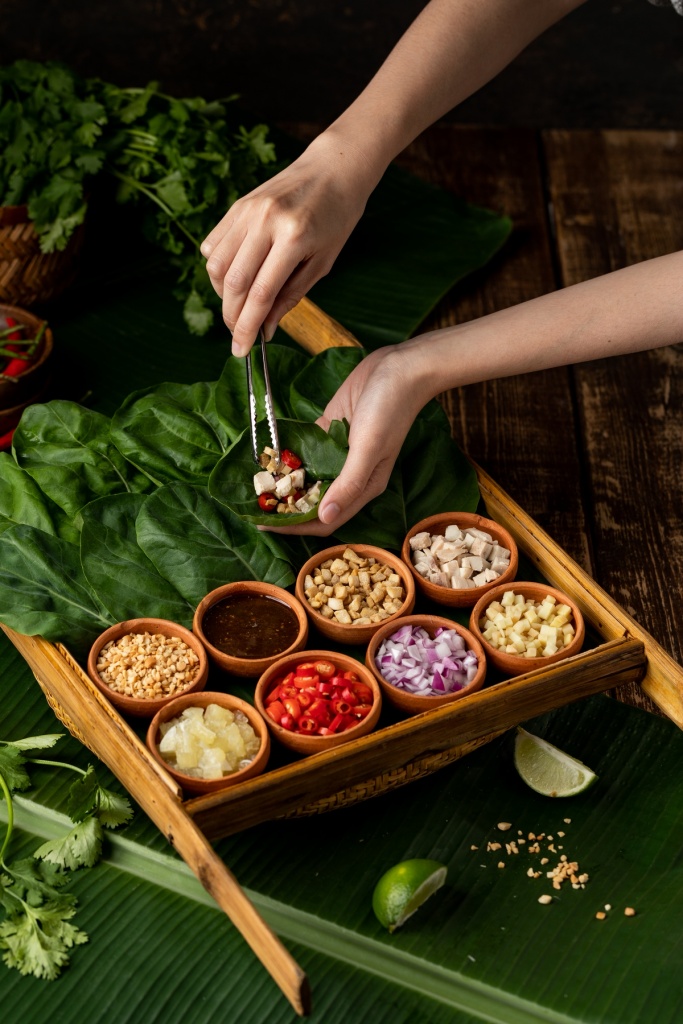 「帕泰家甘藍手卷」是其他泰國餐廳吃不到的經典美味,源自泰國當地傳統小吃Miang Kham(蜜延堪),將口感柔軟細膩的甘藍葉捲成漏斗形狀,放入雞肉丁、檸檬角、辣椒、紅蔥頭、花生碎、薑與主廚特調的羅旺醬料一次捲起,一口就可嚐到爽脆口感和獨特的清新香氣,讓人一吃上癮。