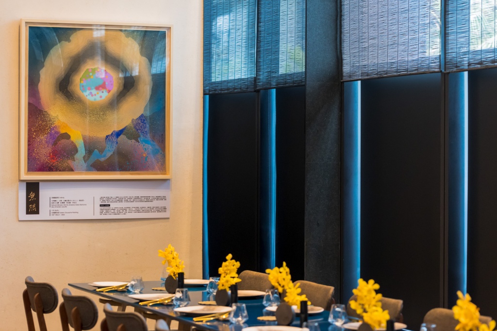 國際藝術家「白魚」林伯禧,將行旅歐洲時尚美感與啟發深入創作,徹底實踐生活美學的真諦,過去林伯禧曾在台南晶英舉行「聆聽」個展,近期成立台灣與米蘭、巴黎、比利時等多位知名藝術家共同研討的「無隅新藝術畫派」,首幅創作「無隅風華」即大方贈予台南晶英同名餐廳。「無隅風華」以紅珊瑚、黃金、白鑽等多種代表「永恆」的天然礦物性顏料,及具文化意義的古墨,透過寬廣澎湃的技巧,表現對未來的無限驚喜與期待。