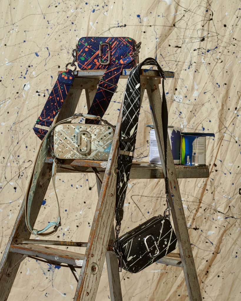 靈感來自Marc Jacobs噴漆牛仔褲,每款包都是手工潑彩上去,每個包都擁有獨一無二的圖紋。潑彩系列共推出黑白、灰藍及藍橘3種不同色系混搭的潑彩圖紋。藝術氛圍十足的潑彩將品牌熱賣的包款The Snapshot 相機包、Small與Mini尺寸的The Tote Bag裝飾更加獨特。潑彩設計也延伸到休閒鞋,皮革材質與亮眼對比色的鞋帶,微厚的鞋底更能拉長腿部比例。