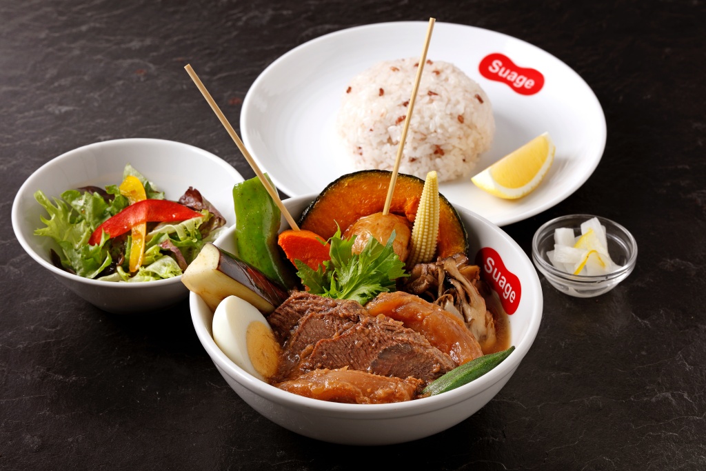 北海道湯咖哩名店Suage特別推出全新含有滿滿膠原蛋白的「燉煮月亮軟骨、虎掌湯咖哩」與「味噌精力燉煮牛筋湯咖哩」2款以燉煮為基礎的美味。同步推出風味香甜的芒果霜淇淋、芒果起士塔、芒果拉昔等芒果季節甜點。