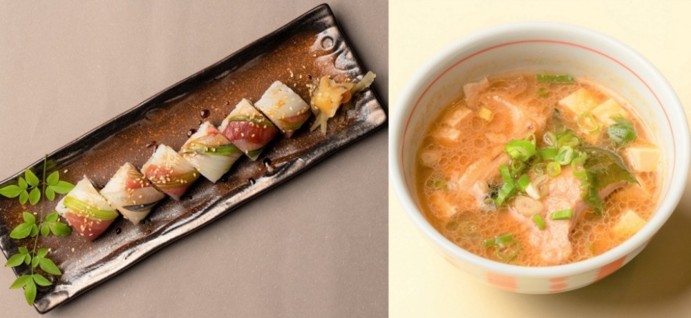 「海膽三色細卷」滿滿的海膽放入細卷內,再以鮪魚刺身、軟絲、水針魚包捲成為海膽三色細卷,海膽在口中爆漿,濃郁海味爆擊味蕾。「腹皮油味噌湯」取用鮪魚多處豐厚的皮下組織,加上靠近肋骨的魚腹肉,以3種味噌調配出的完美比例,讓味噌湯不只有豐富的層次,也有鮪魚滿滿的膠質與營養。