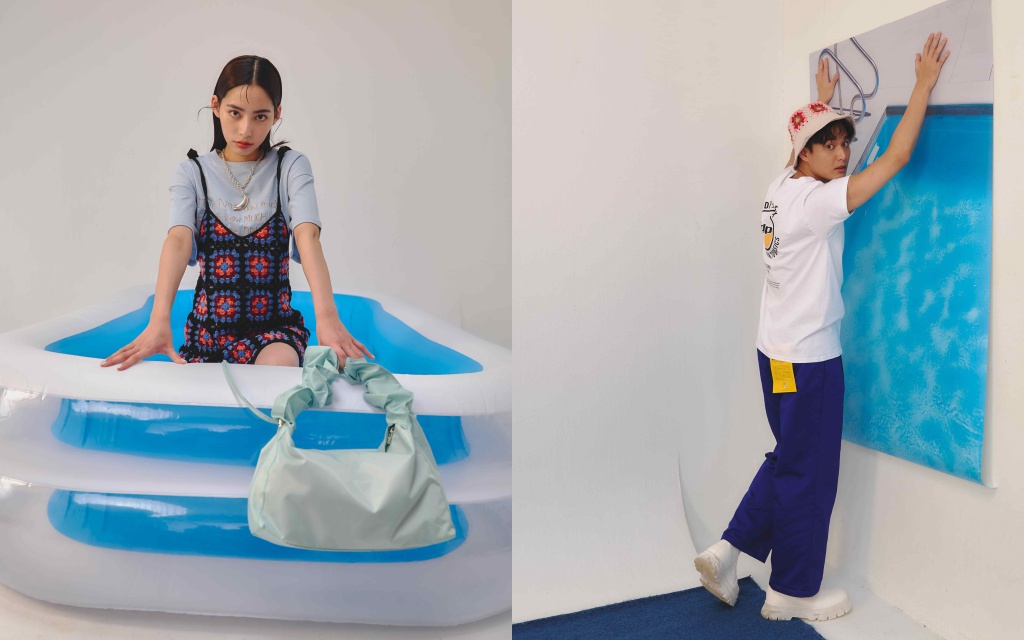 「第三章—泳池派對」夏至色調為正午飽和的天空藍,張貼泳池海報,躺臥在塑料泳池畫面,選用法式街頭DDP、甜美龐克jouetie等設計感服飾品牌,創造怪趣既和諧的衝突感。