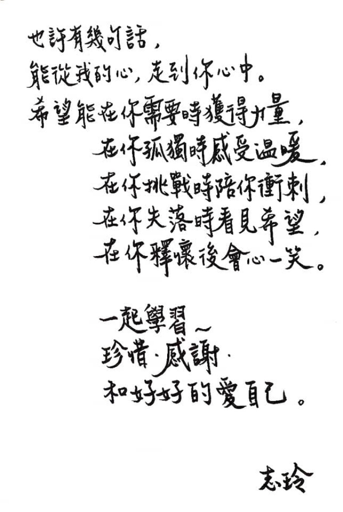 有段時間大家很喜歡替別人貼上各式各樣的標籤,如果要替我貼標籤的話,請幫我貼上「微笑的標籤」。未來的未來,希望大家想起我的時候,腦海中浮現的,是一抹暖暖的微笑。