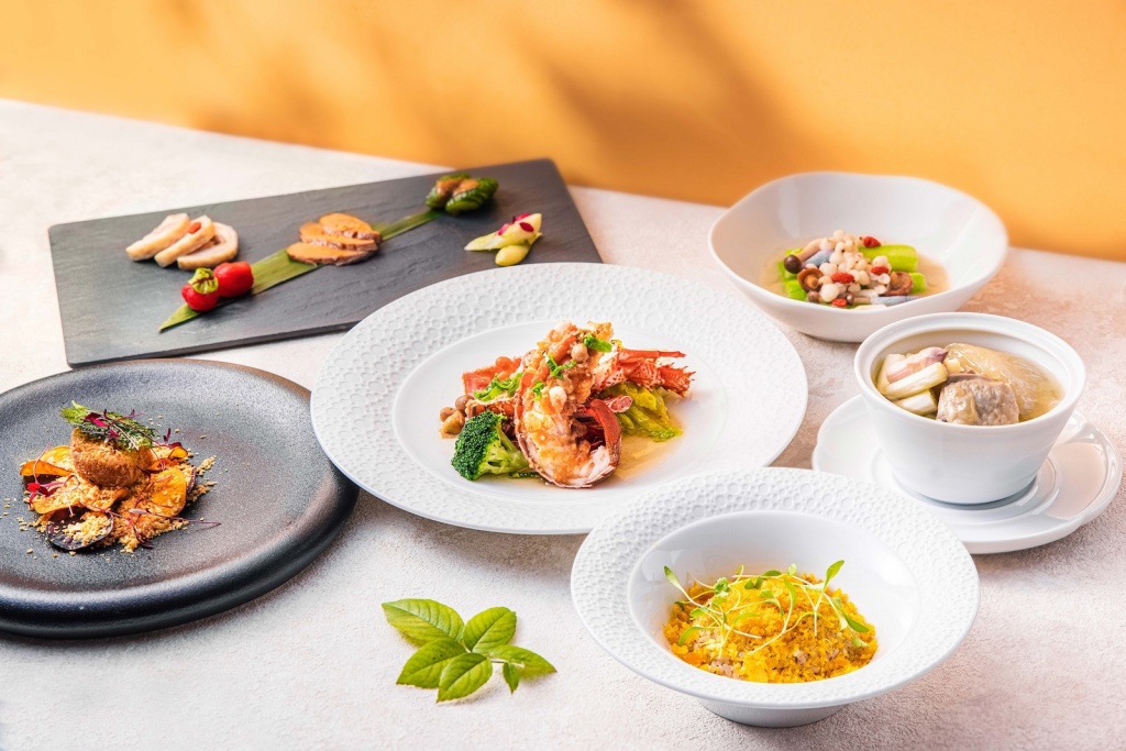 主菜可享用樹子瓜蓉蒸龍蝦,特選整隻活龍蝦清蒸後淋上台式樹子醬提味,品嘗飽滿鮮味的彈牙的龍蝦肉;金沙烏魚子炒飯將烏魚子切成細末狀,與雞蛋、米飯拌炒,起鍋後刨上滿滿烏魚子刨片,炙燒過後更添香氣。