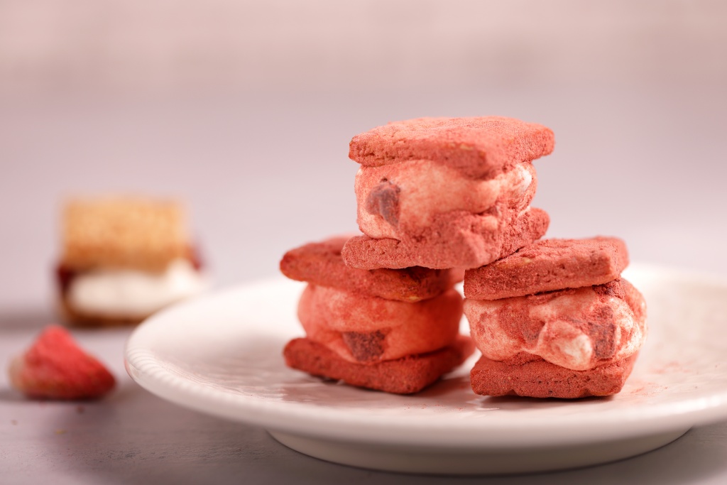 大湖冷凍乾燥的草莓果粒與糖漬草莓乾也被納入牛軋糖元素,與覆盆子粉、夏威夷豆、開心果等拌入糖體靜置24小時定型,分切完成的「覆盆子草莓牛軋糖」切面紅、白、綠三色相間,既好看又好食,酸甜滋味討喜。