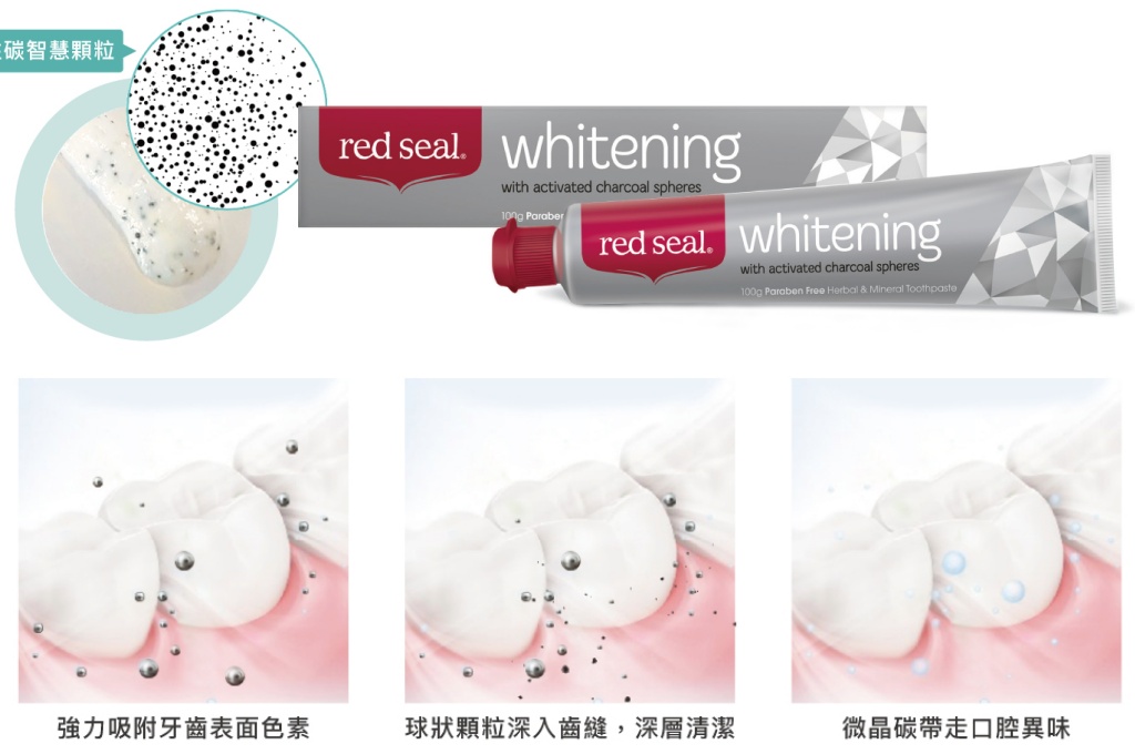 red seal紅印智慧活性碳科技「冷光鑽白牙膏」,以微晶碳強力吸附牙齒表面色素、掃除口腔異味,球狀顆粒可深入牙縫,深層清潔不易刷到的齒間縫隙,隨著刷牙時來回刷動自動融解、帶走齒縫間汙垢,隨時隨地打造一口清新潔白的牙齒。