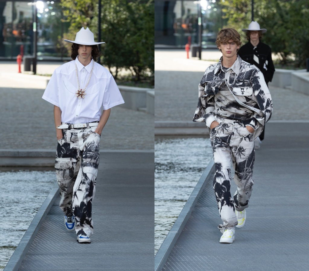 材質採用有機與天然質地的面料拼接交錯,包含緹花針織、草編、嵌花網眼、燈芯絨與府綢。襯衫、褲子與工裝百慕達褲加入剪線工藝(fil coupé)。