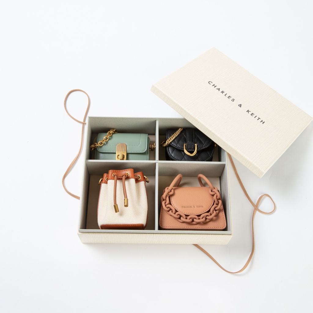 CHARLES & KEITH戀戀夏日迷你包組以禮盒的形式呈現,如原生木紋的精緻外盒,以天然駝色皮繩綑紮,帶來優雅質樸的閒適氛圍,盒底搭襯柔沙色的風格質感置物墊,既可當作擺飾置物,亦可作為滑鼠墊使用,燙金色LOGO細膩皮革如聚光燈襯托每款迷你包的精巧別緻,顯現出CHARLES & KEITH對細節處理的用心,