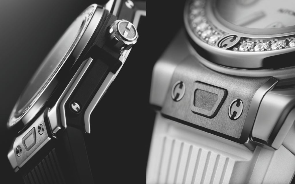 Big Bang One Click精鋼鑽錶共有亮麗白面盤與性感黑面盤,有39毫米女王款與33毫米名媛款,錶圈分別鑲嵌42顆與36顆鑽石,3點鐘位置設有日曆視窗,搭配同色系天然橡膠錶帶。透過專利「One -Click」單鍵快拆錶帶裝置,只需分別按壓12點與6點位置的梯形按鍵,即可拆卸更換錶帶。