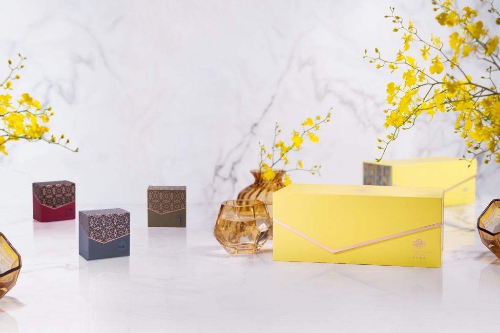 寒舍集團全新推出的「寒舍盛典」禮盒,精選各餐廳人氣點心為啟發,讓老饕可一次品嚐珍味,以皮薄透帶有光澤的桃山餅皮製作、相較傳統餅皮更能凸顯料美滋味。禮盒上綻放著翩翩起舞的蝴蝶蘭,取台北喜來登館內設計圖騰為意象,花語有興隆與招財之意,鮮活嫩黃色調更彰顯富盛卻又不失雅逸,大器又獨具特色。