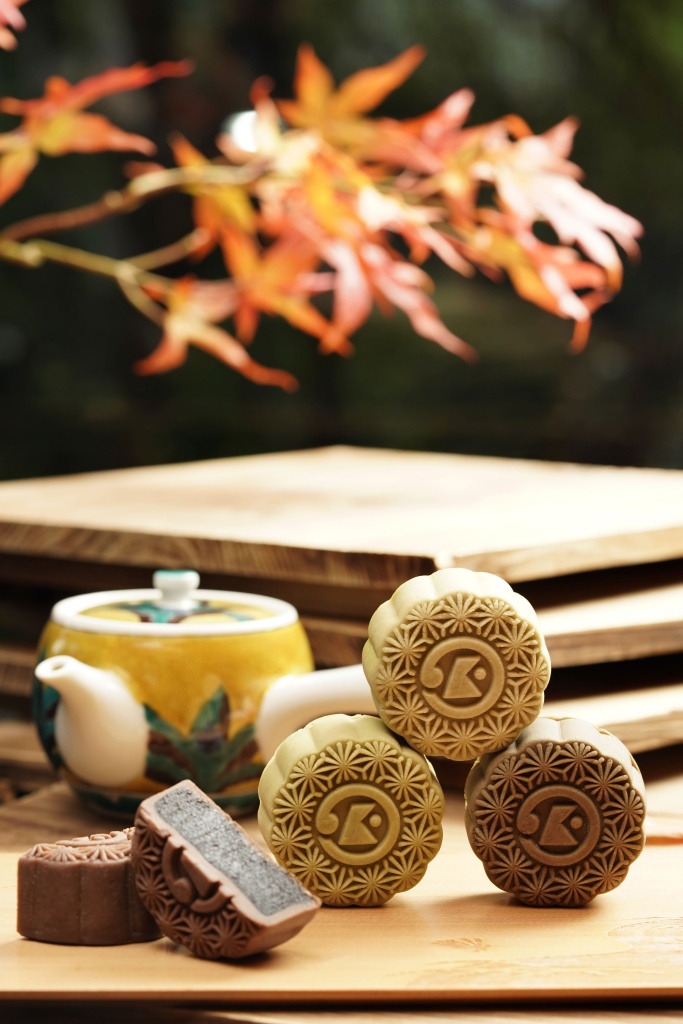 「金栗焙茶」月餅:焙煎過後焙茶香氣與栗子融合,豐盈香醇的回甘搭配栗子淡淡甜味。「濃醇芝麻」月餅:黑芝麻綿密滑順,一口咬下芝麻香氣溢出。