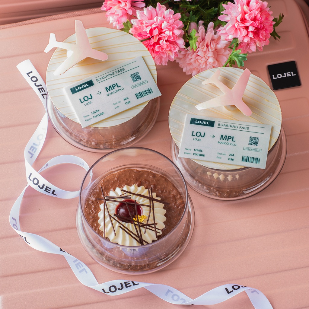 另一款法式杜斯巧克力米布丁,法國經典甜點米布丁(Riz au lait)與巧克力的完美搭配令人無法抗拒,搭配超可愛機票與飛機裝飾,彷彿一秒就能飛到巴黎,盡情飽覽法國風景,堪稱視覺與味覺的夢幻饗宴。