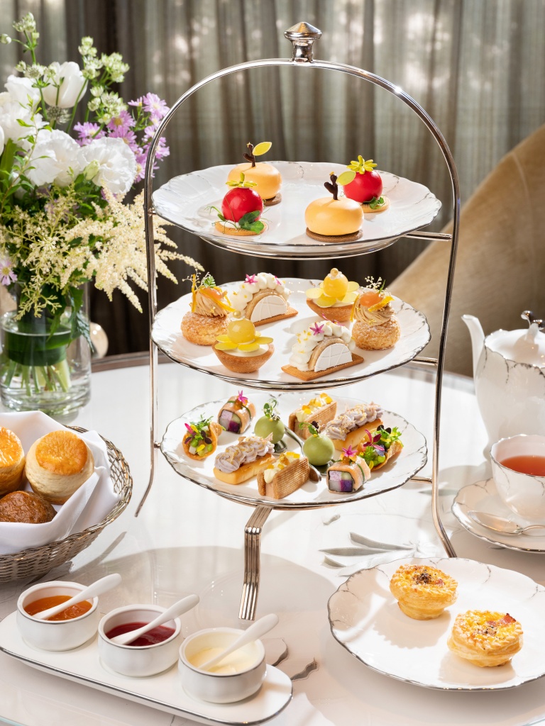 下午茶的底層為干貝冷湯、煙燻鮭魚鹹派、有機鮮蔬口袋餅、燻鮭魚時蔬捲、烤鴨芋頭麵包及橘子鴨肝慕斯6款鮮美精緻鹹點,包含文華東方酒店最受歡迎的經典傳統英式司康,外皮香酥內鬆軟的司康,搭配2款文華東方自製手工果醬與德文郡凝脂奶油(clotted cream),經典風味令人難以忘懷,帶來高貴淡雅的完美文華東方午茶時光。