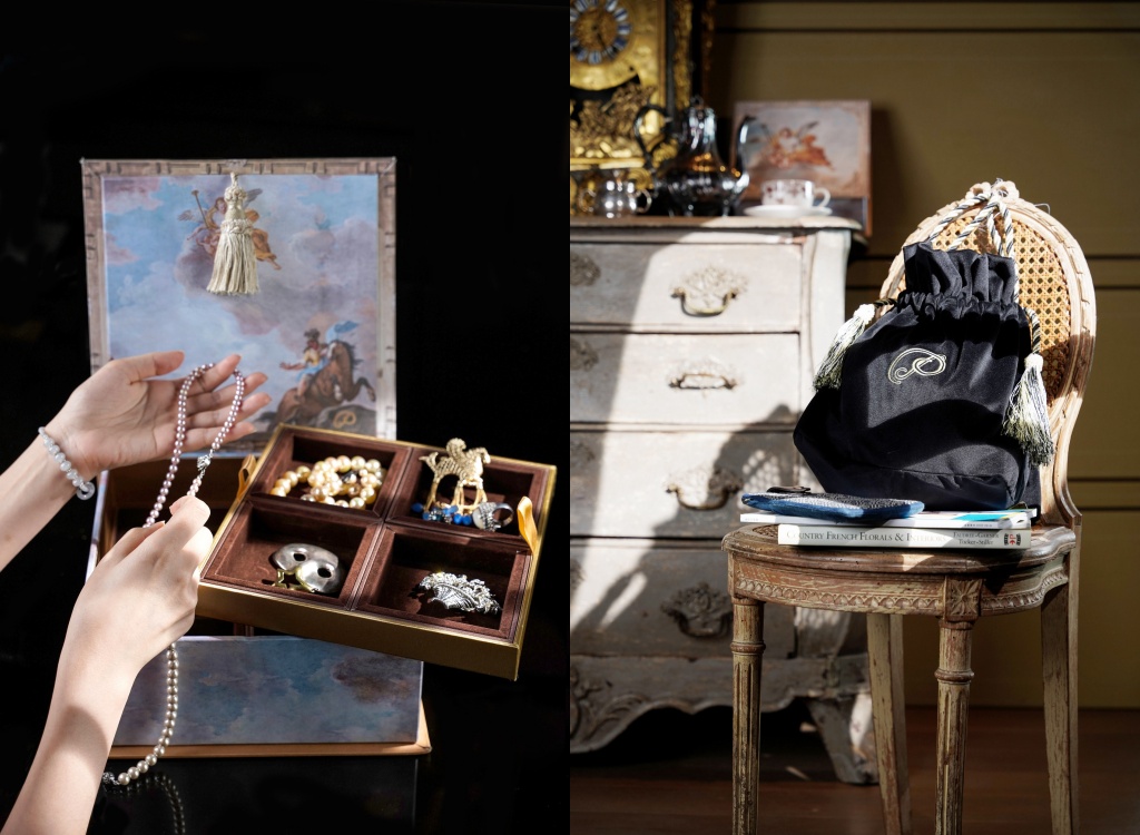 君品翡冷翠寶盒以古典壁畫搭配別具匠心的雙層盒設計,可再利用作為優雅的珠寶收納盒,外袋則是精緻刺繡的絨布提袋可手提亦可肩背,成為外出優雅的時尚單品。設計如歐洲珠寶盒般展現君品酒店的優雅風格,外盒彩繪畫作來自雲朗觀光義大利佛羅倫斯「翡冷翠百花宮」貴族宅邸18世紀濕壁畫天花創作,結合東方優美的中秋茗茶月餅,與西方歐洲壁畫色彩,充滿氣質文藝。