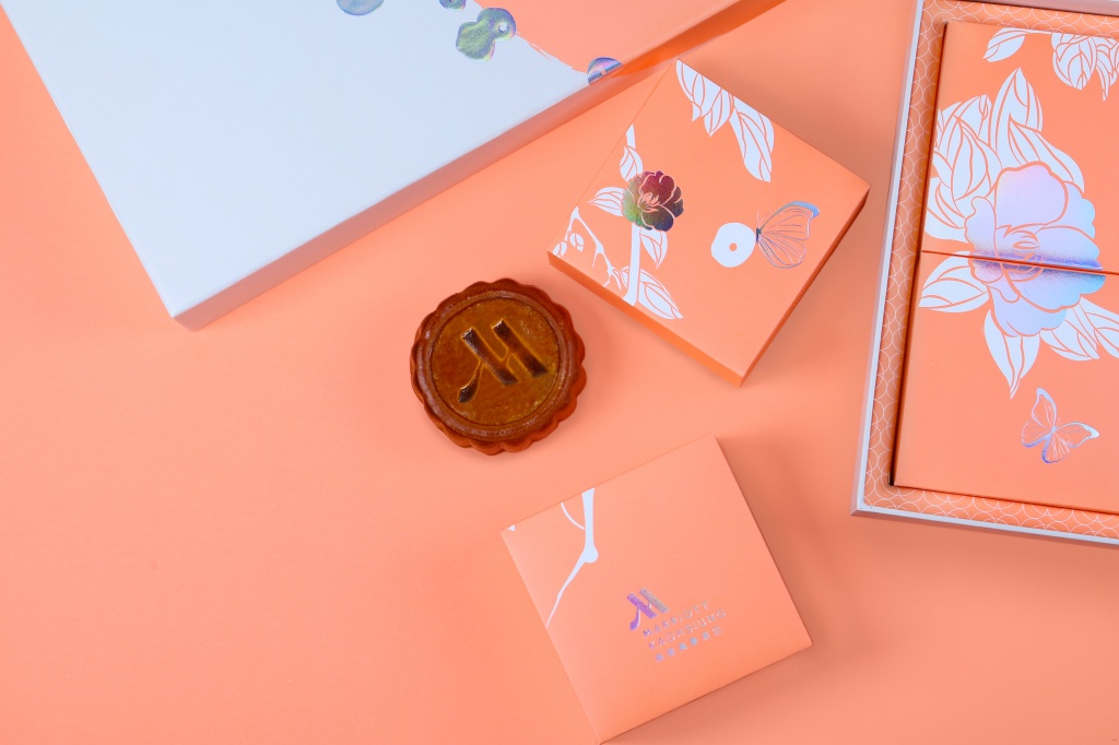 高雄萬豪酒店豪月中秋禮盒採限量發售,以溫潤亮眼橘色調為主視覺,點點銀光如一輪明月高掛映照在海面,波光淋漓,銀光閃耀,內盒以山茶花綴上曼妙飛翔的蝴蝶花紋,散發時尚優雅極致品味,彰顯獨特與眾非凡。