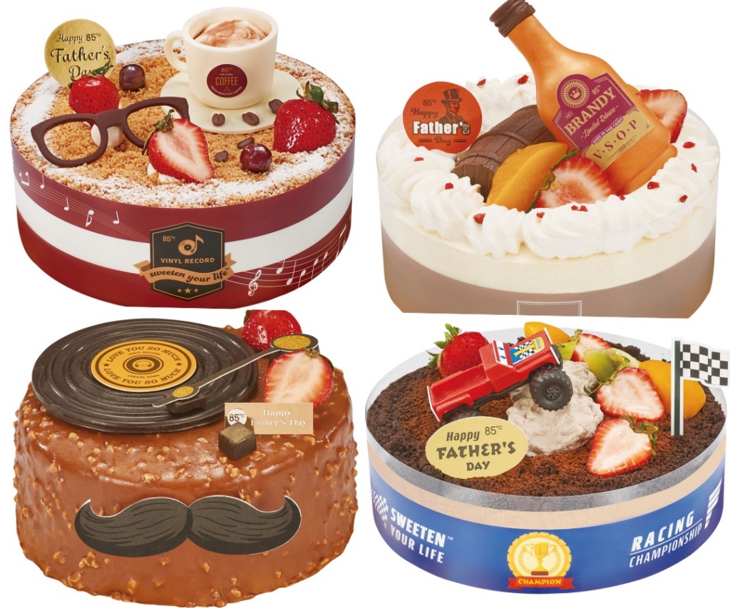 85ºC以「食尚紳士老爹」為主題,推出4款造型蛋糕,6吋「愛樂可可」金沙淋面外觀像個沉穩成熟的紳士,上頭還有復古黑膠唱片;6吋「霸氣一番」為喜歡小酌的爸爸,擺上擬真的小酒瓶與酒桶;8吋的「越野先鋒」與「啡常紳士」,各以不同造型與口感,給辛苦的老爸不一樣的驚喜。