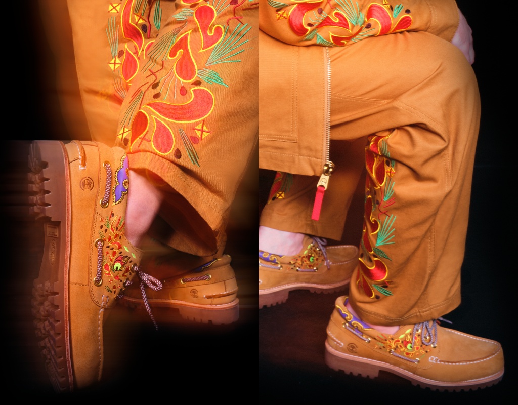 TIMBERLAND╳CLOT系列服裝亦採用100%機種植綿及100%再生綿等天然環保物料打造,而具保護性的重磅帆布,則以Timberland標誌性小麥色調展現,再以色彩豐富的刺繡圖案點綴。