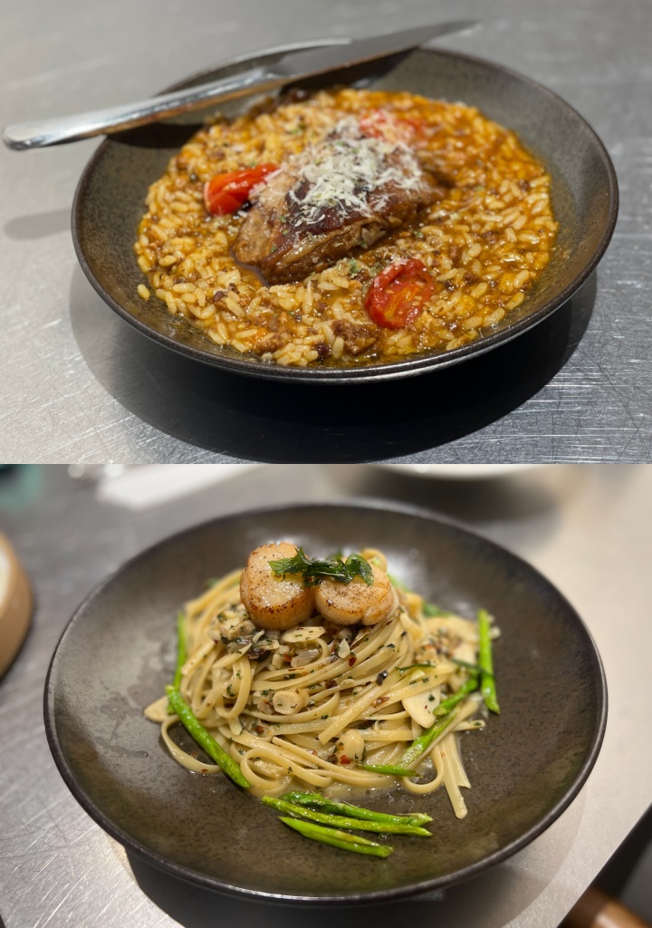 主食特別推薦炒松露野菇燉飯,以經典義大利米熬煮而成,口感偏向正宗義大利燉飯米心偏硬,米粒吸滿松露醬汁後以巴薩米克醋做點綴,每口香氣濃郁口感滑順。偏辣口味的蒜炒干貝義大利麵,新鮮飽滿又具彈性的干貝,爆香炒過後與義大利直麵及香脆籚筍融合,蒜香味撲鼻而來令人食慾大開。