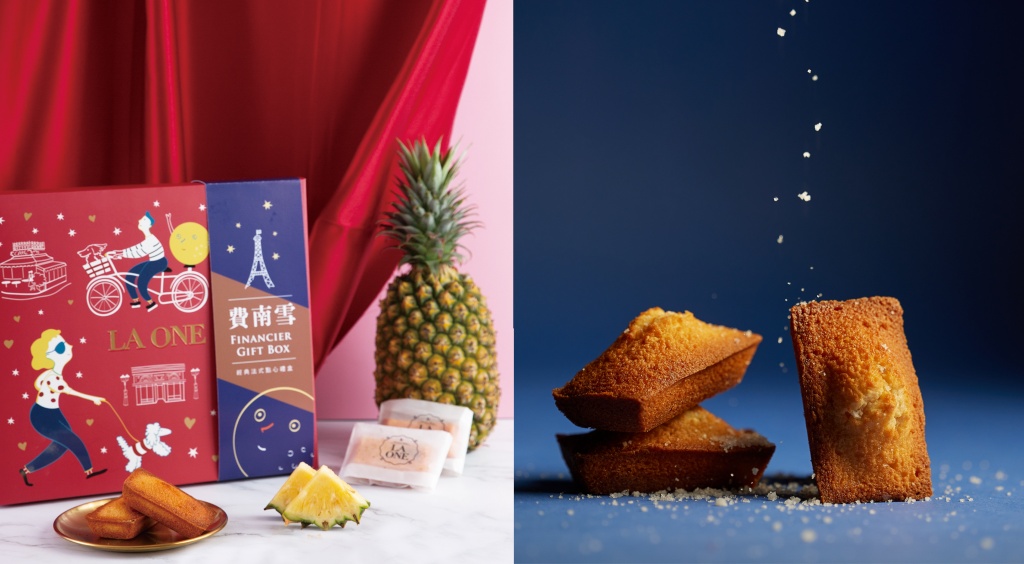 「鳳梨費南雪禮盒」費南雪宛如金磚、氣派的方形外觀,很適合做伴手禮。添入臺灣土鳳梨內餡,具「旺來」吉祥含意。焦化奶油的榛果香氣與鳳梨酸甜氣味相互映襯,吃不膩的美味小點。