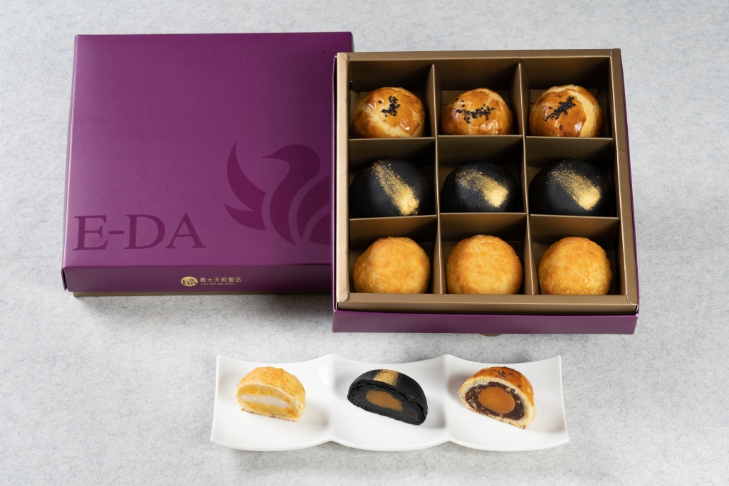 義大天悅飯店另推出「星悅紫金禮盒」,包括芙蓉酥、黑金芝麻酥與波蘿松子黃金酥3款手做糕點,3款口味各3顆,九宮格式包裝。