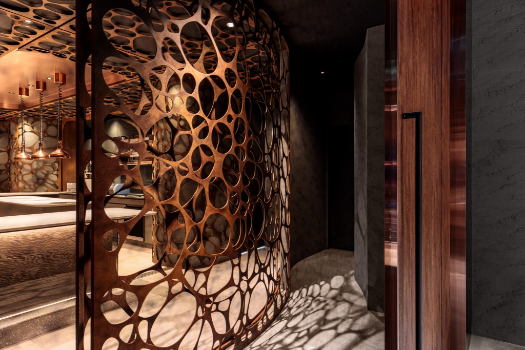 推開兩百多公斤厚實的杉木大門,洞穴裡的天地豁然開展,高雅樸實中點綴星空閃爍,岩石孔洞意象貫穿全場,金屬鏽蝕鐵板,質地透出沈沈的礦橘色,流暢的弧角與大大小小穿透的孔洞,隱喻岩石層層堆積與主廚科學料理概念,都是由一顆顆細胞經年累月組成。