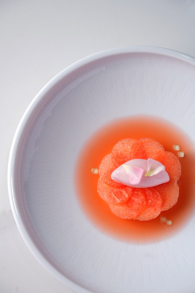 17席橘色高腳座椅,圍繞主廚展演的中島開放廚房,25坪空間,賓客與主廚都是穴居中流動的要角。高硬度石英石桌面、加高模石子腳踏,方便置放包包的布閣、玫瑰金馬賽克洗手間,搭配不同氣氛的旖旎燈效,從氛圍到使用的流場度,在在都可感受設想周到的巧思。
