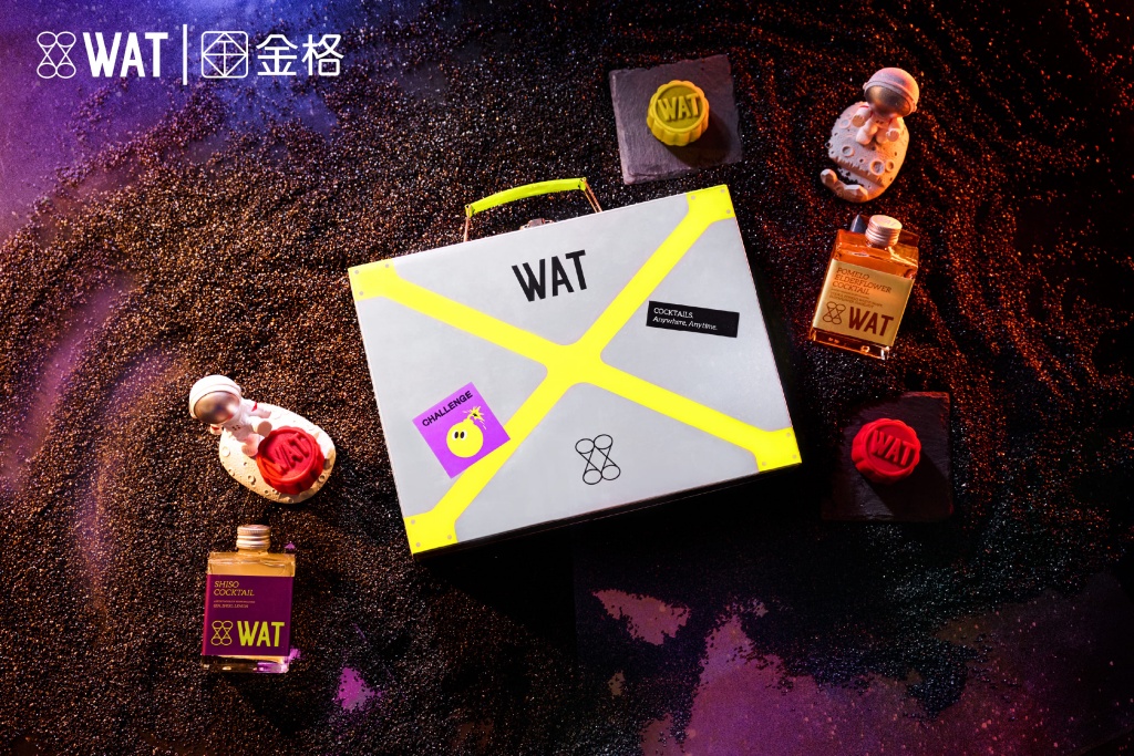 WAT首次以雞尾酒入餡,大膽攜手精品甜點品牌金格食品跨界推出2022年中秋聯名限定禮盒,結合WAT熱銷且應景的「貴妃鐵觀音雞尾酒」、「文旦接骨木花雞尾酒」 與直接以同款酒品入餡的「貴妃鐵觀音月餅」 、「文旦接骨木花月餅」,搭配金格榮獲100%無添加潔淨標章明星商品「長崎蛋糕脆餅」,帶來月餅獨創甜香風味。時尚質感霧灰銀太空手提箱盛裝,完美結合年輕調酒及頂級餅藝,激盪出潮流與傳統混血新文化,就是要帶給消費者一場極致味蕾饗宴,在與家人團聚賞月的美好佳節時分,微醺甜蜜上月球。