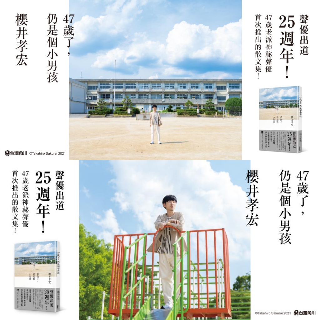 為了紀念《47歲了,仍是個小男孩》繁體中文版上市,台灣角川特別向日方申請,使用櫻井孝宏的照片製作獨家內封,值得粉絲收藏。讓我們從這本散文集裡,重新認識這位充滿魅力的聲優吧!
