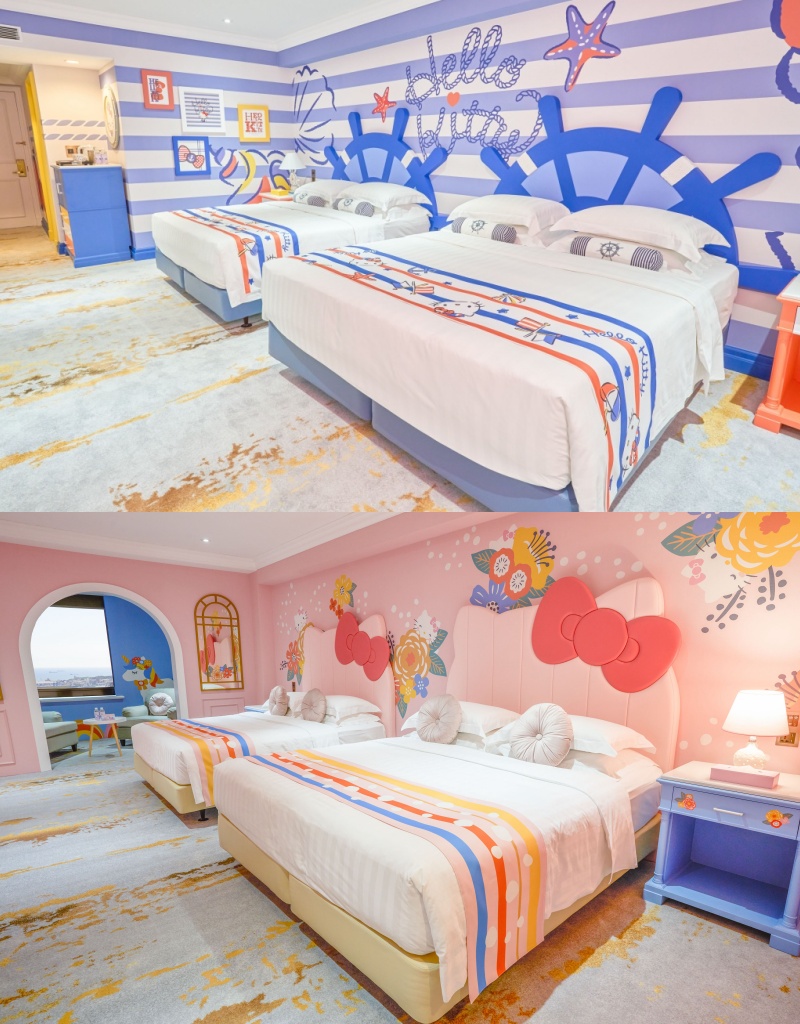 房間設計是重頭戲,推開門就開始進入三麗鷗大明星世界,主題造型床頭板是房間靈魂所在,壁面圖騰則是故事延伸,搭配沙發、床頭櫃、床旗都呼應角色系列舖陳,天花板與壁面空間也加裝造型燈飾巧思佈置,浴室裝飾也與臥室相呼應,淋浴間玻璃、掛畫都有各大明星的蹤影。
