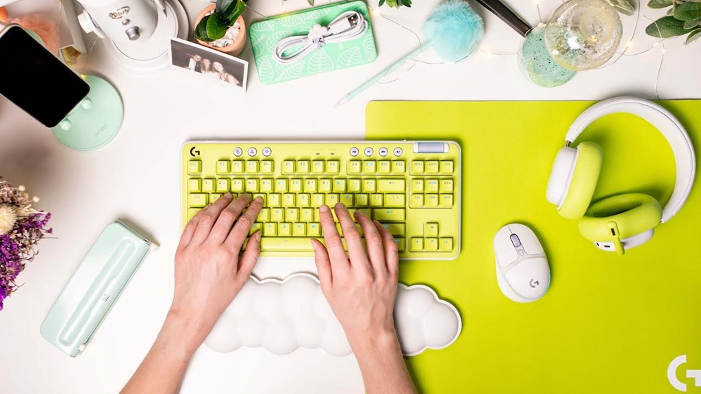 「G715& G713美型炫光機械式鍵盤」具備多媒體快捷與音量轉盤,搭配GX紅軸與茶軸兩種軸體,採用PBT鍵帽與可替換面板設計,按鍵盤時很有觸感,鍵盤聲音像打字機一樣非常療癒,提供Q萌雲朵造型手托,撫慰又能保護手腕。G715支援LIGHTSPEED與藍牙雙模無線,具備25小時以上電力。
