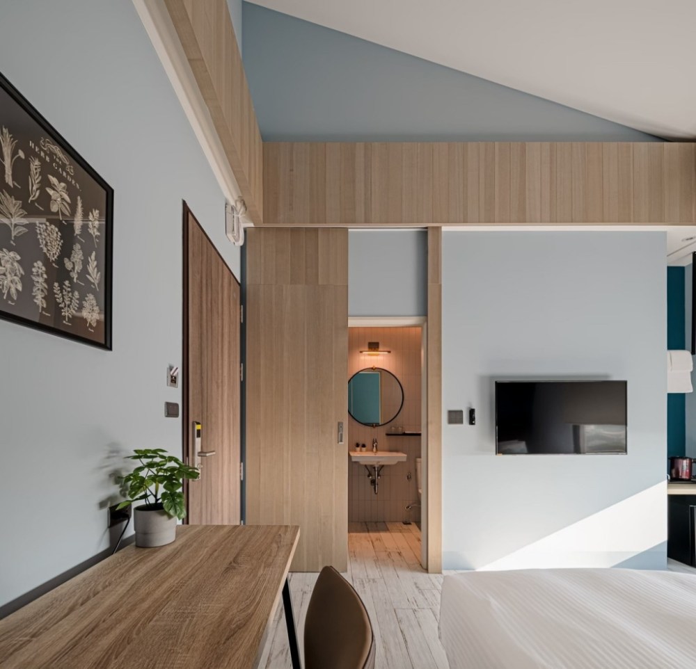 台南安平森行旅全棟樓高7層,5~17坪基本房至樓中樓套房,42間客房依特色風格分為6種房型,細節融入臨海遼闊、潮間湖色、隱潮泥灘、岸石藻綠、大地生機、落日暮霞等自然主題,強調大量自然採光及視覺穿透感。