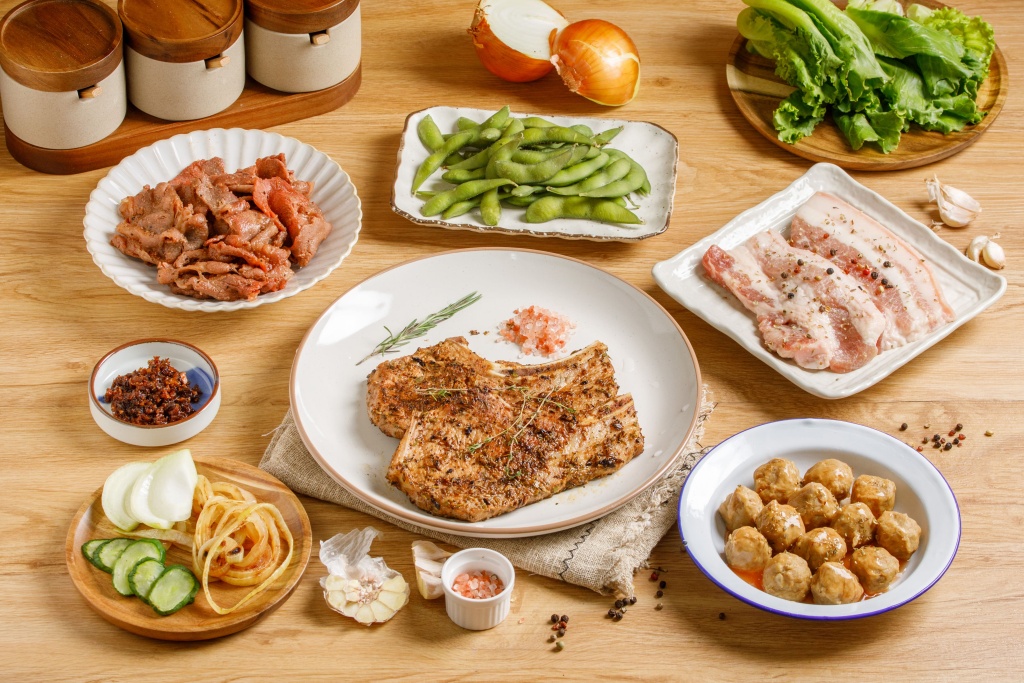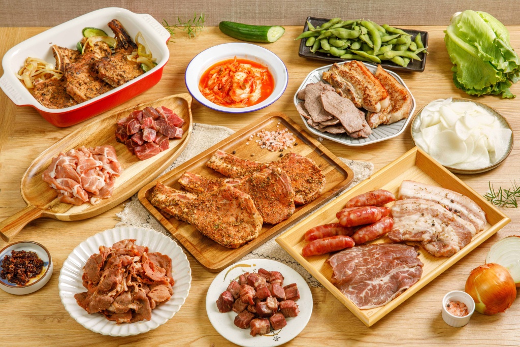 台畜今年推出限量「豪華韓式經典肉肉烤肉組」,包含最受歡迎的「CHOICE美國牛肉」、烤肉必備經典「鐵板燒肉片」、「鹽麴五花肉」及餐廳等級「厚切戰斧豬排」等6種老饕肉品,滿滿好肉鋪滿烤盤,脂甜肉嫩,帶來視覺與口感的豐盛滿足。