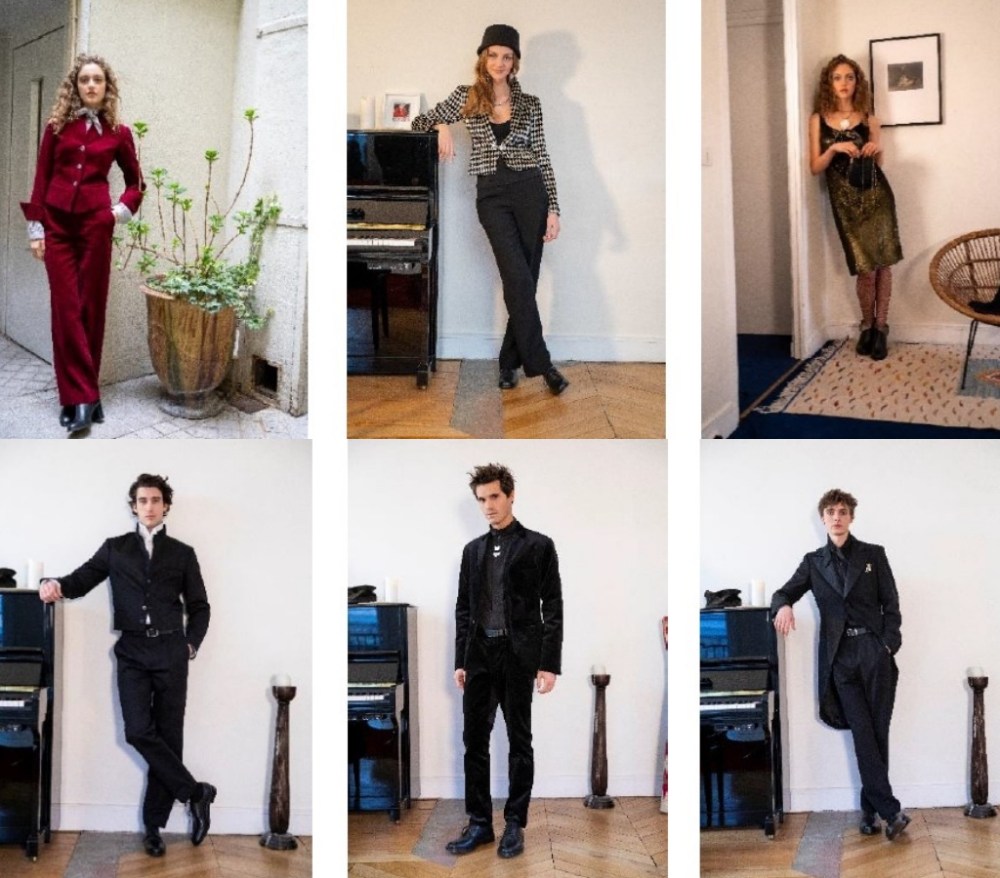 agnès b.男士西裝樣貌多元,包含正式感十足的燕尾服、展現翩翩貴公子風範的絲絨西裝、及較為輕鬆的Spencer短版西裝外套等,搭襯獨特的附領結襯衫、立領襯衫,經典黑白配色,重現丹迪男孩的風姿綽約,享受巴黎夜生活。