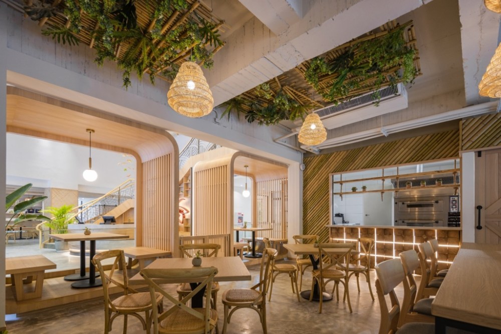 餐廳以永續概念進行空間設計,保留建物的原始毛坯天花板,搭配桃源村盛產的竹製裝置藝術,使用籐製吊燈與引進的自然日光相互搭配,在設計感十足的空間「吃在地、品當地」,未來將在2樓露台打造星空酒吧,能夠欣賞翠綠山谷環繞,蜿蜒溪流中的滿天星斗。
