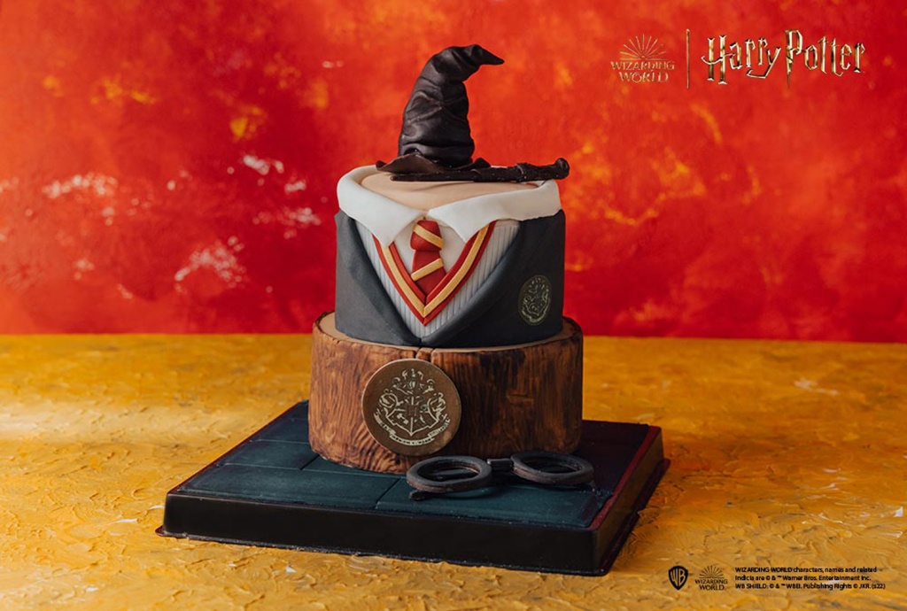 「哈利波特」手工翻糖蛋糕由學院分類帽、哈利波特魔杖置頂組成,以葛來分多學院紅黃制服配色製作蔓越莓紅醬、原味奶香費南雪色系相映內餡,猶如電影中主角初入學時,分類帽為哈利波特探測學院歸屬。