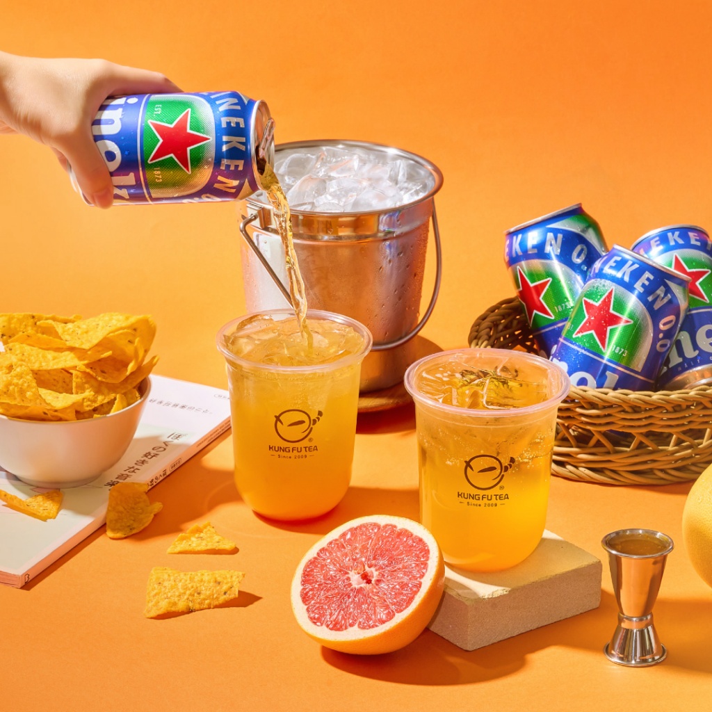 手搖飲品牌KUNG FU TEA功夫茶再度與海尼根合作推出期間限定零酒精飲品「柚見海尼根0.0」,主打零酒精,純天然原料及獨創A酵母發酵高品質製造過程,真空蒸餾的方式移除酒精,才能釀造出有如拉格啤酒般清爽順口的味道。兼具有熱量低、不用侷限場合、清爽順口等三大優點。