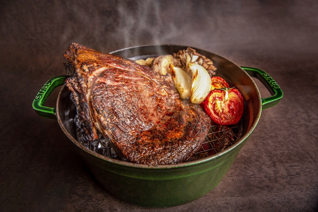 主廚選用油花豐厚的美國Prime頂級帶骨肋眼,全炭火費工烤炙而成,取自義大利「王者之酒」巴羅洛酒風味醇厚的釀酒桶木,將肋眼放置於以炭火燒灼後的巴羅洛酒桶木上燻香賦味,酒桶木香氛單寧與肋眼相互交融,口感帶有些許櫻桃木、龍眼木香氣,尾韻中更透出雅緻的紅酒酸,以鐵鑄鍋盛盤上桌,開蓋立即香氣四溢。