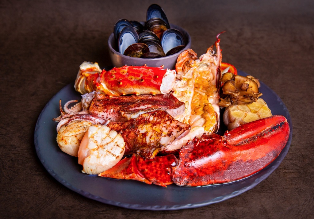 海鮮料理推薦「海鮮盤」,嚴選波士頓龍蝦、北海道帝王蟹、墨魚、北海道干貝及貽貝,以海鹽、黑胡椒佐味後直火炙烤而成,再淋上些許檸檬汁,鮮甜海味直端上桌。