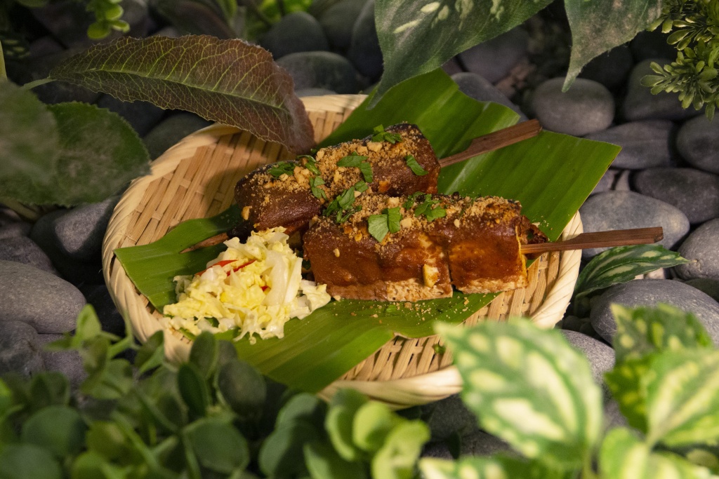沙嗲烤臭豆腐串以東南亞特色小吃沙爹為發想,使用OATSIDE巧克力燕麥植物奶製成巧克力沙嗲醬。以花生與巧克力的經典搭配帶出獨有堅果香氣,與燕麥奶的溫潤口感合為一體,最後撒上的酥脆燕麥粒,為香烤臭豆腐帶來濃醇風味。