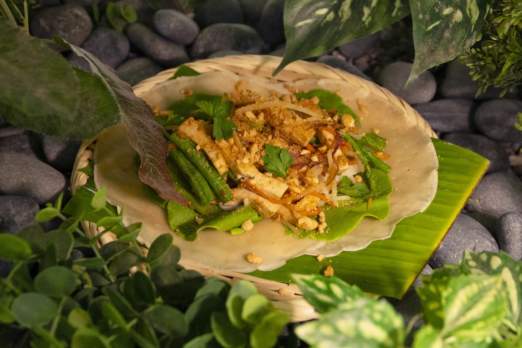 瘦子燕麥奶潤餅以台灣與新加坡常見小吃潤餅為啟發,Tim主廚使用OATSIDE職人燕麥植物奶打造獨特燕麥奶潤餅皮,抹上特製豆瓣醬,搭配奶油萵苣、醋溜土豆絲、鮮蔬、花生,捲起一口咬下時,燕麥奶的清甜香氣、豆瓣醬的甜辣風味與蔬菜的清脆爽口一次享有,獻上傳統與創新的層次口感。