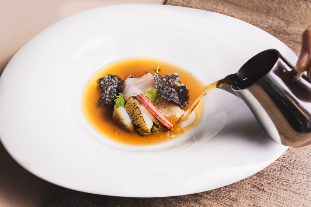 歐陸法式餐廳的菜單也盡現寶島台灣味,主廚李中煜Peter發想自南台灣古早味番茄切盤的開胃小點、以北投在地名品魷魚螺肉蒜酒家菜為靈感的湯品「南非鮑魚/澎湖小卷/馬祖淡菜/魷魚澄清湯」。主菜特選為軟嫩多汁著稱的14天熟成「彰化胭脂鴨與巨峰葡萄」。
