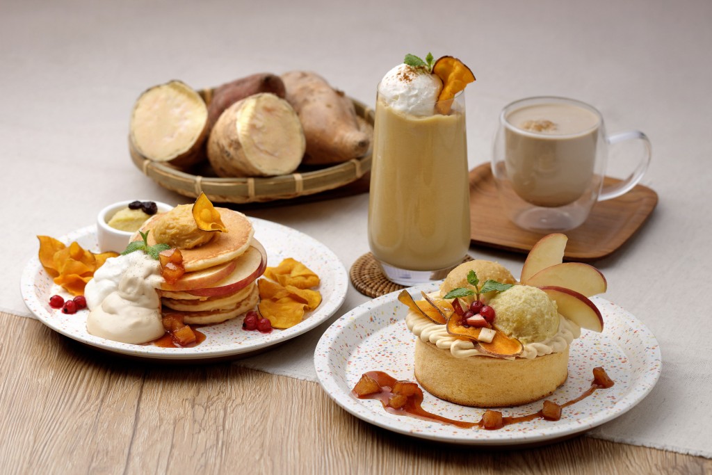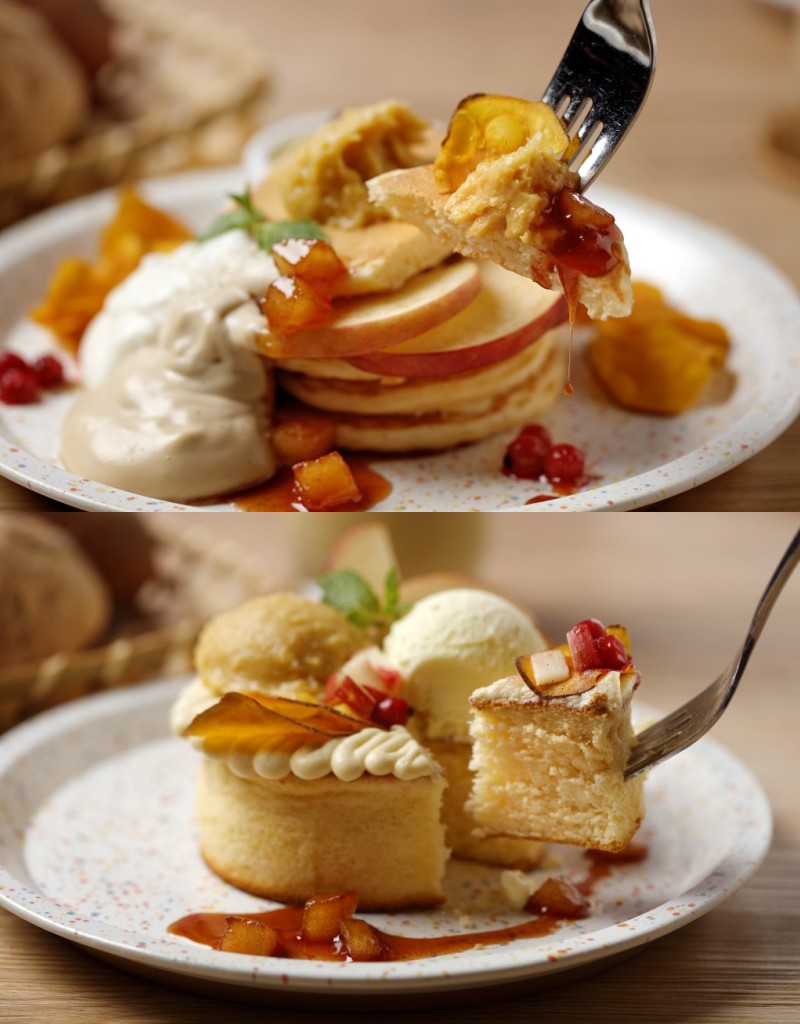 杏桃鬆餅屋選用苗栗台農57號地瓜、66號地瓜,藉由黃肉地瓜鬆Q、綿密等口感,推出甜薯鮮奶油香蘋厚鬆餅,上層兩球分別是加入奶油調和,口感輕盈香甜的甘藷奶油,及增添冰涼濕潤的香草冰淇淋,風味更豐富。特別優雅地擠入口感清爽的甘藷鮮奶油,與肉桂蜜醃漬的蘋果丁、脆口甘藷片、蘋果片、莓果等點綴,為厚鬆餅帶來看似濃郁卻一點都不膩的秋季美味。
